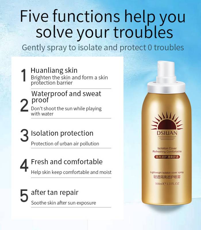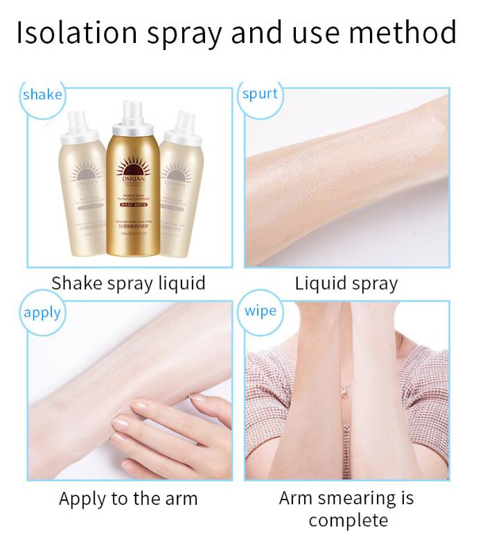 The Light Transparent Isolation Mask Spray is a refreshing and lightweight spray designed to provide a protective barrier while offering moisturizing and brightening benefits. This anti-UV spray helps shield your skin from harmful sun exposure, preventing sun damage while brightening and whitening your complexion. Its breathable, transparent formula absorbs quickly without leaving a sticky residue, leaving you feeling refreshed and protected throughout the day. Perfect for women on the go, this multi-functional body spray ensures your skin remains hydrated, glowing, and safe from UV rays.